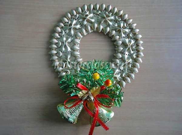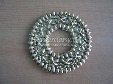 Покрыть новогодний веночек из макарон можно серебрянкой или золотистой краскойПрежде чем складывать венок, посмотрите внимательно на то, все ли компоненты гармонично выглядят друг с другом. Если есть проблемы с цветом или формой – исправьте недочет.