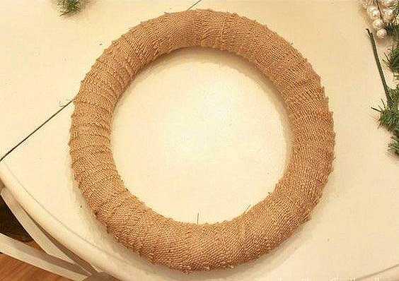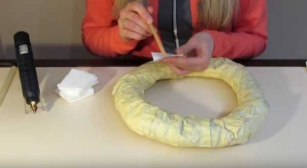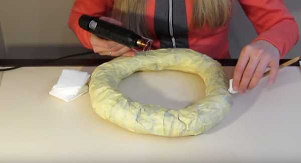 2. Обматываем заготовку мешковиной или декоративной сеткой, как в нашем случае. Клеевым пистолетом приклеиваем её к основе венка.