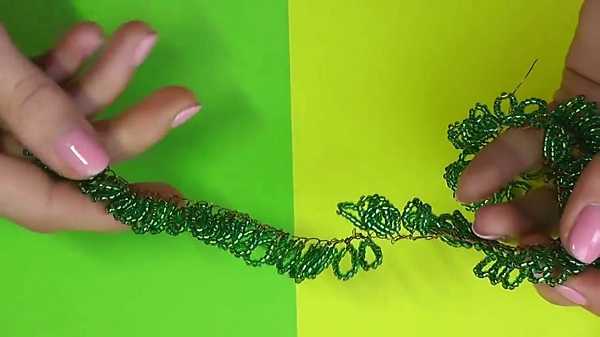 1. Первым делом нам нужно сплести из бисера елочные веточки. Для этого на медную проволоку вдеваем как можно больше бисера.