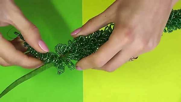 10. Золотистые бусины вдеваем в медную проволоку и обматываем её вокруг венка.