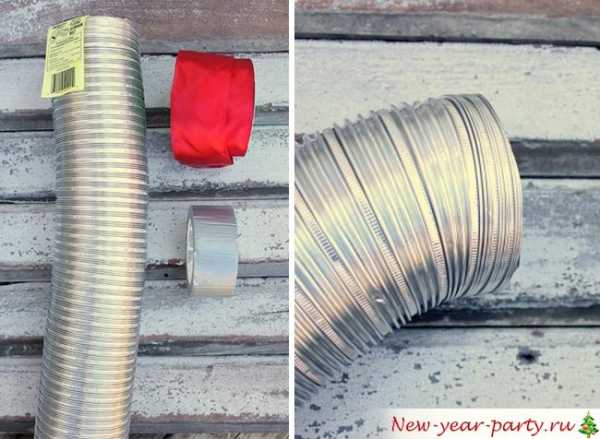 Оригинальный материал – вытяжная труба. Блестящую, аккуратную, одинаковую по всей длине вытяжную трубу достаточно согнуть кольцом, а место соединения замаскировать красивой лентой, новогодним «дождиком».