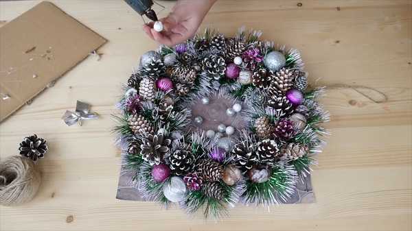 12. Теперь приклеиваем к основе венка шишки с получившимися елочными веточками.