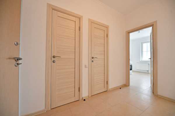 Двери деревянные, есть ограничители, что тоже очень удобно и предусмотрительно. На полу уложили кафель и ламинат, на стены наклеены флизелиновые обои, которые можно покрасить в любой цвет.