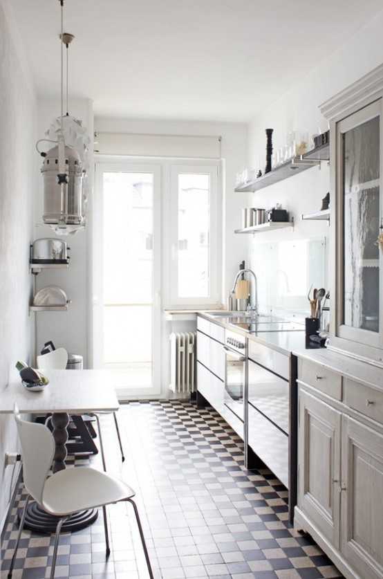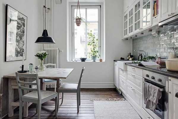 В малогабаритной квартире возможен вариант узкой и длинной кухни, дизайн которой вызывает некоторые сложности. В этом случае подоконник будет играть роль столика, а кухонный гарнитур, размещенный вдоль стен, должен быть компактным и функциональным. В этом случае стол должен быть небольшого размера. Вы можете полностью перенести обеденный стол в гостиную, освободив тем самым пространство кухни для приготовления пищи. Разместите мебель таким образом, чтобы дверцы шкафов могли открываться без осложнений. Для визуального увеличения пространства вы можете выбрать шкафчики со стеклянными дверцами, использовать зеркальные поверхности.