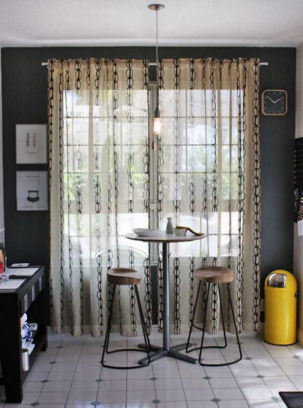 Очень аккуратно нужно акцентировать внимание на узорах и рисунках. Карниз должен висеть немного выше окна. С помощью этого нехитрого способа потолок визуально увеличится.
