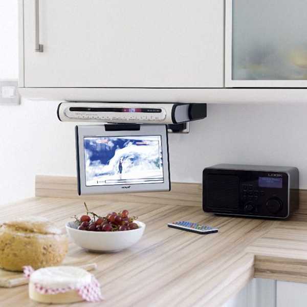 Любите во время ужина посмотреть телевизор? Разместите его на отдельной полочке. Есть множество приспособлений для крепежа, поэтому установить его можно где угодно понравившимся вам способом.