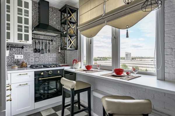 Занавески на совмещенной кухне можно использовать легкие, прозрачные, рулонные или жалюзи. Пол на совмещенной кухне может иметь порожек. Чтобы не демонтировать порожек можно сделать уровень пола на балконе виде подиума. Кухня, совмещенная с балконом или лоджией, выглядит на много уютнее и светлее, а дополнительные метры всегда есть возможность приспособить для функциональных и нужных вещей.