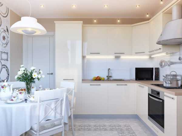 Разнообразить дизайн маленькой кухни в бежевом либо белом цвете можно яркими деталями – красочными шторами, светильниками и люстрами, декором стен и другими интересными элементами интерьера кухни.