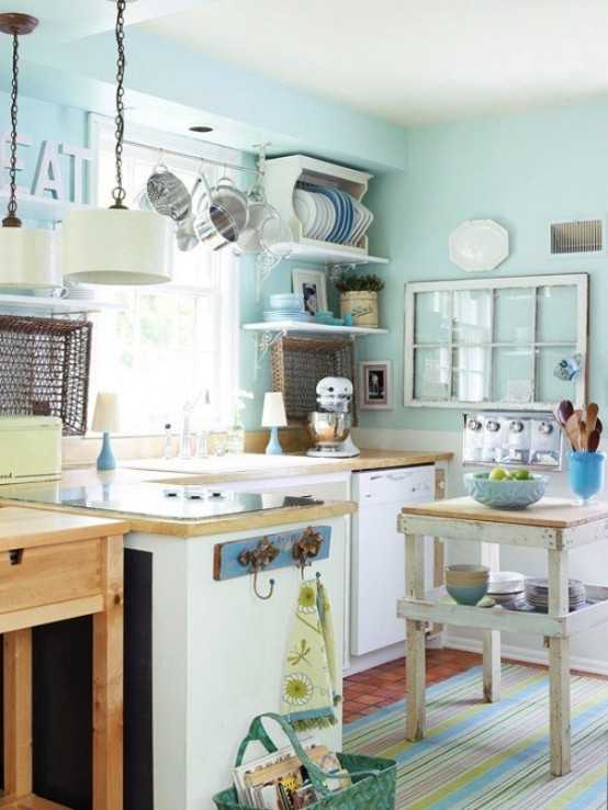 Если же кухня маленькая, то можно в интерьере применить деревенский стиль. Этот популярный стиль подразумевает снятие всех дверок со шкафов, а вместо них весятся небольшие занавески.