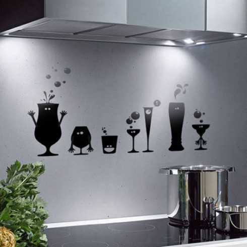 Рабочую стенку можно украсить наклейками и стикерами. Производители предлагают множество вариантов на различных основах и широчайшей цветовой гаммы. Если плитка на вашей стене белого цвета и вы любите классический стиль – чёрные контрастные полоски будут смотреться просто великолепно!