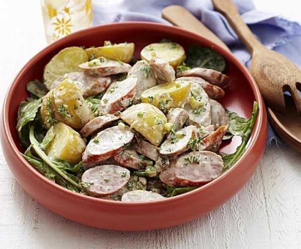 - Смешай в миске картофель с сосисками, добавь оставшиеся ингредиенты, перемешай, приправь солью и перцем и снова перемешай.