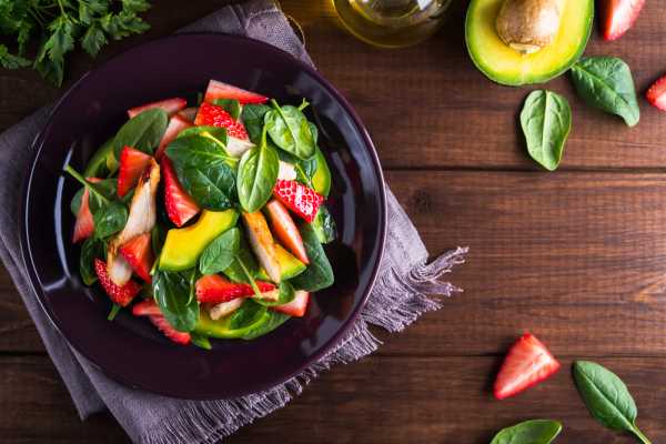 В закрывающийся контейнер выложите горсть промытого и просушенного бумажным полотенцем шпината. Почистите и порежьте слайсами небольшой авокадо, разрежьте 4-6 ягод клубники. Куриную грудку порежьте небольшими кусочками, поперчите, посолите и обжарьте на масле на среднем огне до готовности, минуты 4-5. Выложите курицу на отдельную тарелку, пусть остынет, а затем переложите в контейнер. Самая простая заправка для любого салата – 3 части оливкого масла и 1 часть лимонного сока. Заправьте салат и готово!