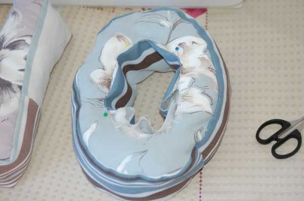 - Выверните заготовку, закрепите булавками внутреннее кольцо и сшейте вручную потайным швом.