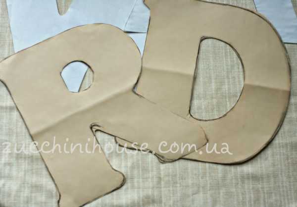 2. Теперь вырезаем буквы и прикладываем выкройку к ткани, сложенной в два слоя. Я использовала лоскутки, оставшиеся из шторной ткани. Для удобства каждую букву прикалываю булавками, обвожу карандашом и вырезаю.