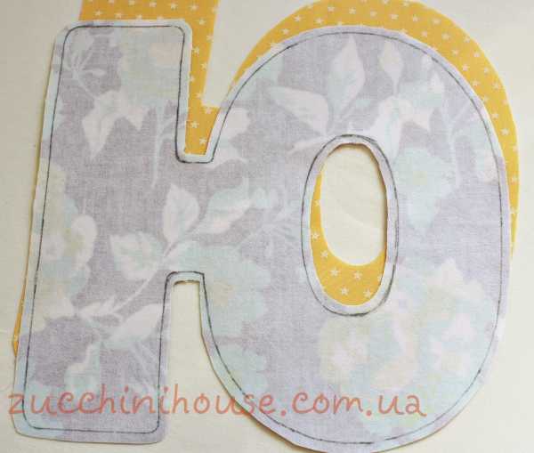 4. Далее уже проще, — осталось притачать по кругу вторую половинку буквы. И вывернуть наружу через внутреннее отверстие («бублик») либо же через незашитые концы боковинок (см. на фото ниже).