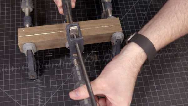 После укладки половинки дощечек склеиваются клеем ПВА, и их оставляют сохнуть под прессом. Суть этой операции в том, что сам стержень не приклеивается к дощечкам. Его диаметр больше, чем диаметр канавки, и для того чтобы конструкция замкнулась – необходим пресс. Стержень же будет держаться в древесине не за счет клея, а за счет натяга деревянной оболочки (специально созданного таким образом преднапряжения в конструкции карандаша).