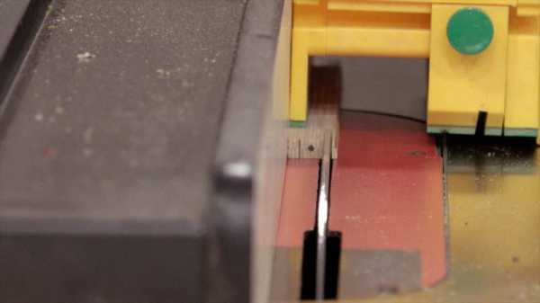 После этого стержни попадают на сборку. Вот на таких станках подготавливаются дощечки для карандашей. В них выпиливаются канавки под установку пишущих стержней.