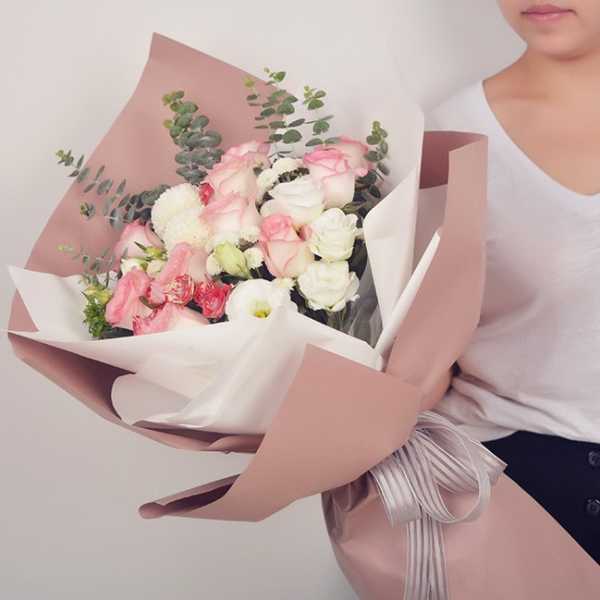 — если оттенок упаковки светлее, чем сами цветы, то они выделяются на общем фоне, привлекая к себе максимально внимание. Лучший вариант — КОРЕЙСКАЯ МАТОВАЯ ПЛЕНКА, благодаря ей букет смотрится невероятно нежно и мило;