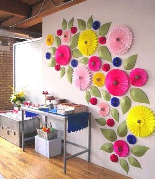 Крупные интерьерные цветы из цветной оберточной бумаги можно крепить на стены, создавая целые цветочные «поляны». Цветы яркие, объемные, поэтому композиции получаются впечатляющими.