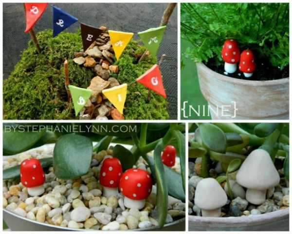 Украсить можно не только горшочек, но и само растение. Например, такими грибами, флажками и камушками.