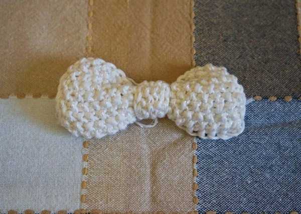 Для того, чтобы связать бантик, выполните спицами элемент прямоугольной формы. Его ширина должна быть такой же, как и ленточка. Основа вязания также жемчужный узор.
