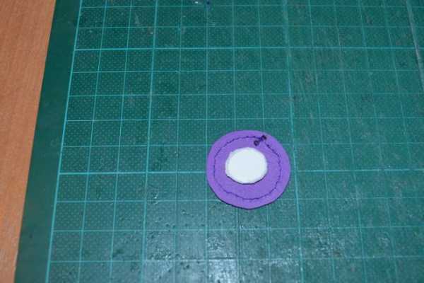 - Из картона вырезаем круг – с лицевой части обклеиваем его бумагой, с обратной пивной картон, а затем прошиваем. Это будет держатель для резинки.
