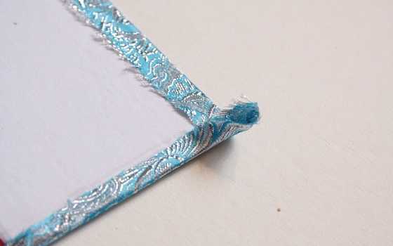 Сначала строго под углом 45 градусов приклеиваем уголки, затем ткань между ними.
