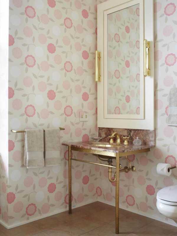 В помещениях с повышенной влажностью и температурными перепадами используются водостойкие и высокоустойчивые к разнообразным неблагоприятным внешним факторам обои, которые могут иметь цветочный принт, акцентирующий внимание на отдельной зоне или визуально расширяющий небольшое пространство.
