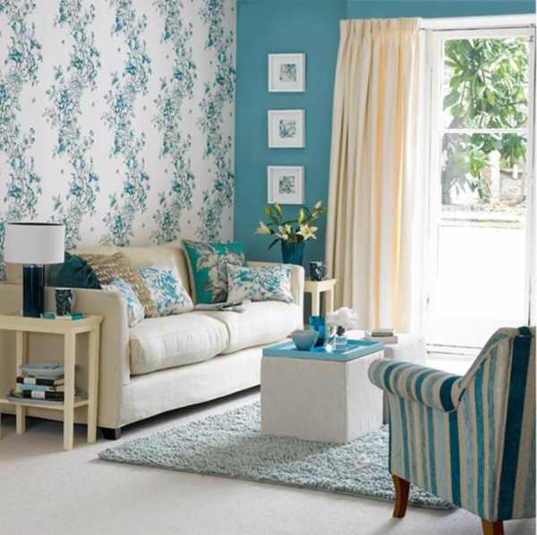 - Чтобы интерьер в гостиной комнате смотрелся тепло и уютно, желательно остановить свой выбор на насыщенных летних цветах в дизайне. В этом случае можно будет подобрать оттенки зеленого, желтого и голубого тона, а также хорошо смотреться будут белые, розовые и персиковые обои в полоску.
