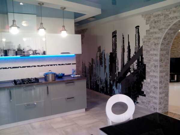 - Голубые обои на кухне делают комнату шире, снижает аппетит, выглядит сдержанно и стильно;