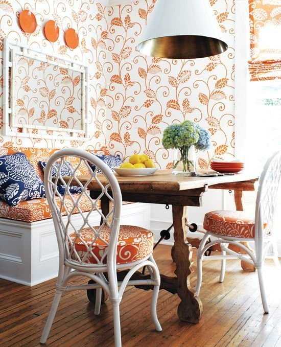 - Оранжевые обои пробуждают аппетит и деятельность. Теплый тон цвета уместен в зоне приема пищи, отлично подойдет для оформления интерьера кухни в загородном доме.
