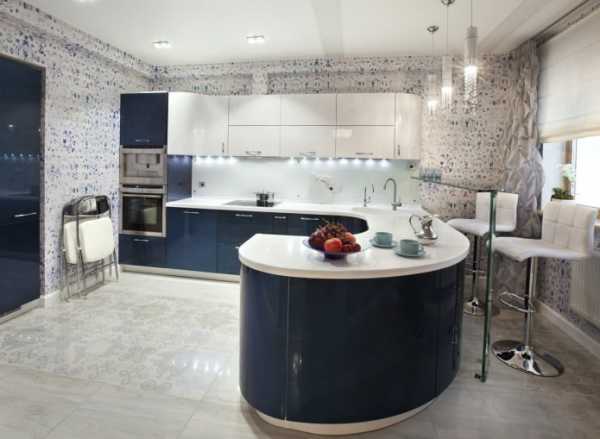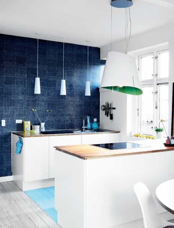 - Синие обои на кухне делают комнату шире, ассоциируются с морем. Не подходят для темных и плохо освещенных комнат.