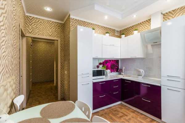 Фото 6. Коричневые обои с «звериным» принтом и фиолетовый фасад нижних ящиков – отличное сочетание в современном стиле.