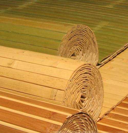 - Бамбуковые. Разрезанный на полоски бамбук наклеивается на тканевую основу. Ширина планок разная, в качестве лицевой может использоваться наружная или внутренняя поверхность бамбуковой полосы. Ширина рулона — от 90 см до 250 см.