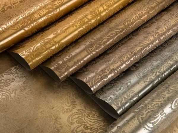 - Металлические или металлизированные. На бумажное основание наклеивается алюминиевая фольга, на которую наносится рисунок, все покрывается слоем лака. Этот вид отделки — влагостойкий, его можно мыть любыми неагрессивными средствами, но только мягкими щетками или тряпками — поверхность легко царапается.