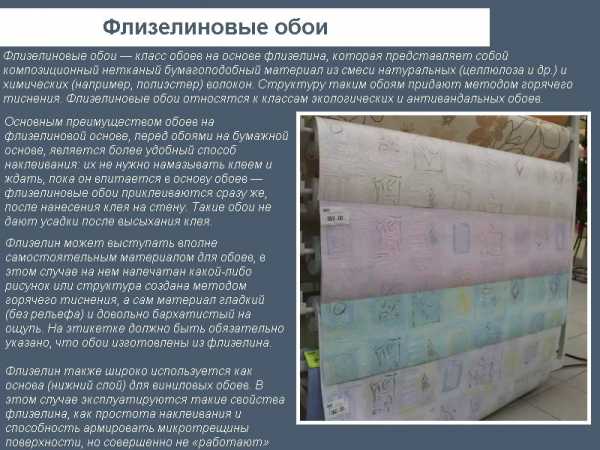 На сегодняшний день существует масса разновидностей обоев для стен: бумажные, виниловые, флизелиновые и пр. В последнее время все большую популярность приобретают такое изобретение, как жидкие обои. Но пока они в нашей стране не очень распространены, как в Европе, мы продолжаем отдавать предпочтение привычным нам рулонам с понравившейся расцветкой и узором. То, что бумажные, которыми обклеивали квартиры в советские времена, являются недолговечными, быстро теряют свой первоначальный вид, мы уже знаем и стараемся их не покупать. Тем более, современный строительный рынок позволяет потребителю приобрести именно те обои, которые являются прочными и не выцветают длительное время. Такими свойствами обладают флизелиновые обои, о которых и пойдет в дальнейшем речь.