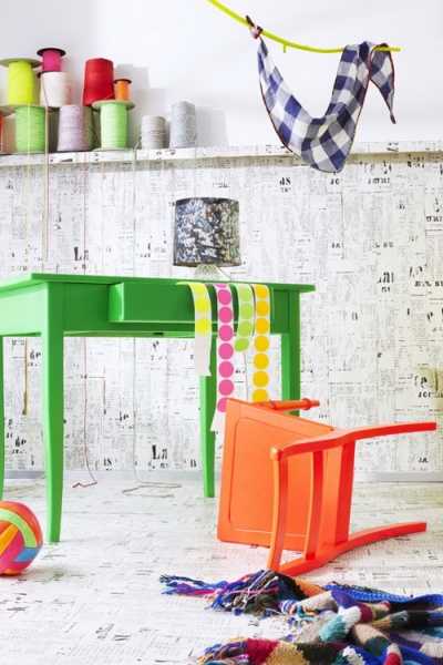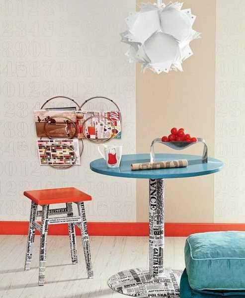 Интересный вариант — предметы интерьера с газетной текстурой (светильник, стул). Тут уже стоит работать в технике декупаж — со специальным клеем, шкурочкой и финишным лаком, аккуратно и надёжно, так как такие объекты подвержены большей поверхностной нагрузке и истиранию, нежели стены.