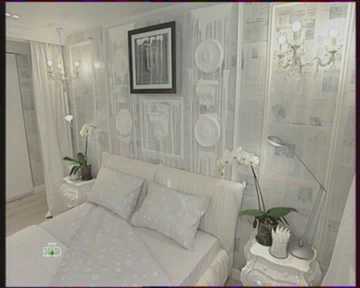 Переделка спальни – Небо, ангел, спальня в Квартирном вопросе с обоями из газет The Moscow Times сделала интерьер бело серым. Показан вариант газет вместо обоев как китч.