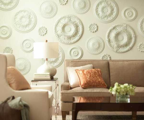 Замысловатая лепнина редко способна вписаться в современный интерьер. Но потолочные розетки, закрепленные на стенах и окрашенные в их цвет, выглядят очень актуально. Стена с такой отделкой становится настоящей изюминкой интерьера.