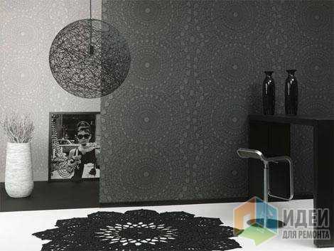 Вторым, не менее популярным направлением является цветной, и в особенности черный, гипюр. Его рисунок будет особенно эффектно смотреться в настенных покрытиях (керамической плитке и обоях), а также — в текстиле. Имитацию черного кружева также можно встретить и в ажурной вязи кованых деталей интерьера.