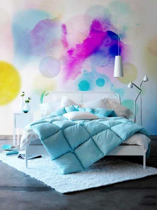 Смело и оригинально смотрятся большие кляксы и пятна, созданные с помощью аэрозольной краски.