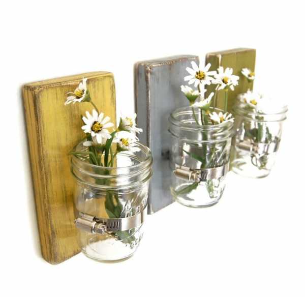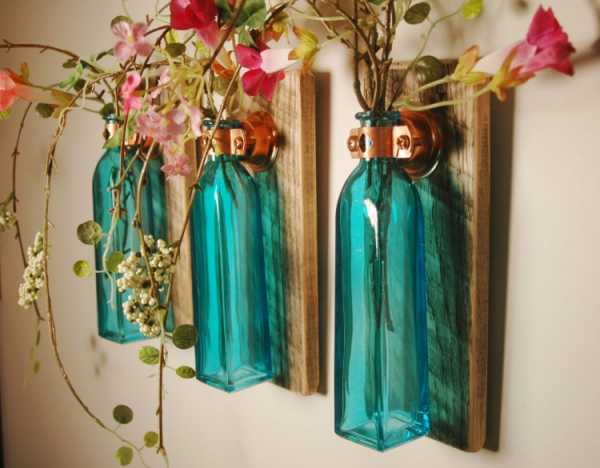 Декоративные вазы или миниатюрные горшочки для растений позволят создать красивые флористические композиции прямо на стене. Вместо ваз можно использовать обычные стеклянные банки, бутылки из-под сока или баночки из-под джема, которые можно, если у вас есть такое желание, оклеить или окрасить. Множество пошаговых проектов, в том числе инструкцию по изготовлению таких настенных ваз, вы найдете в нашей статье «8 идей декора стен своими руками».