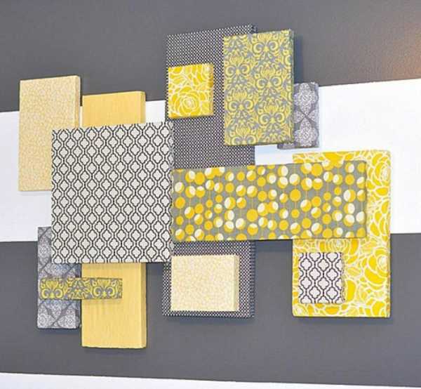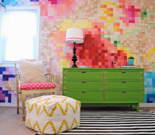 Идеальный вариант для тех, кто делает ремонт и не очень-то хочет задумываться над проблемой выравнивания стен. Яркие квадраты, дополненные объемными фигурами, скроют под собой любые недостатки поверхности. Не говоря уже о том настроении вечного лета, которое приносит с собой такое украшение.