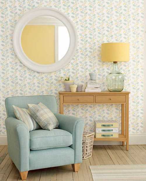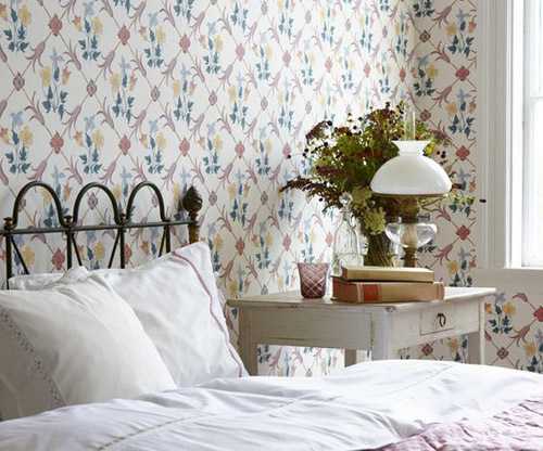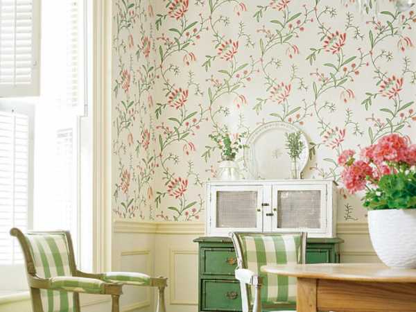 Для работы дизайнеры используют не очень яркие, отличающиеся нежностью тонов обои, покрытые мелким цветком. Чаще всего этими цветами становятся розы, реже – простые полевые цветы.