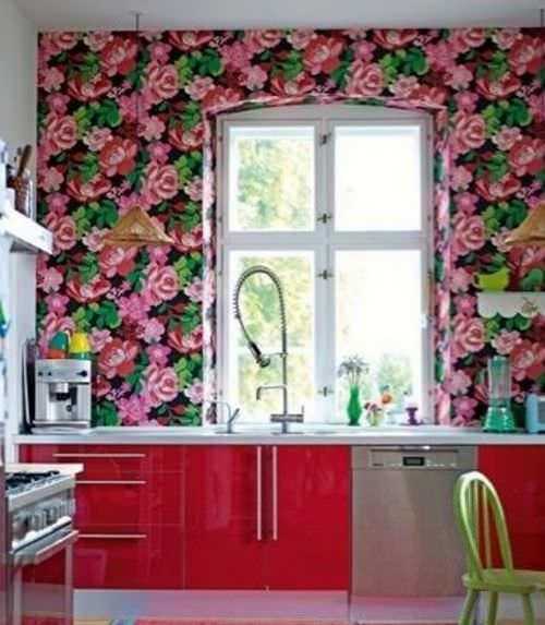 На кухне обои в цветочек буду создавать нежную атмосферу, присущую деревенским домикам или квартирам в стиле прованс. Здесь вы можете не стесняться в выборе даже самых ярких вариантов обоев, если фасады кухни имеют спокойный нейтральный оттенок: белый, черный, серый.