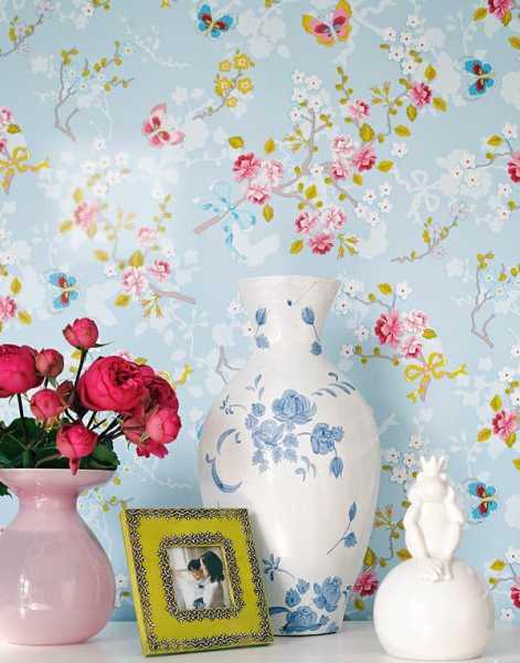 Поскольку обои изобрели китайцы, то становится понятным, почему на первых обоях в цветочек прослеживаются мотивы именно этой культуры. Цветочные бутоны окружали бабочки, национальные фонарики и ананасы. Все выполнялось в красно-черной гамме. Стиль получил название шинаурзи. Сегодня, цветовое поле этого древнего стиля существенно расширено, но, тем не менее, даже используя менее яркие и тонально агрессивные обои этого вида, постарайтесь не превратить свой дом в подобие пагоды. Разбавляйте интерьер скандинавской мебелью.