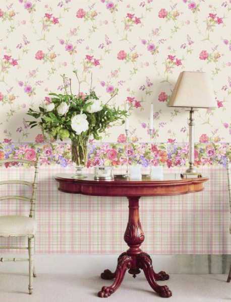 Интересна и эффектна комбинация обоев в цветочек с полосатой отделкой стен. Неплохой можно получиться и комбинация цветок+клетка. Геометричность и упорядоченность полоски и клетки прекрасно дополняется округлостью и плавностью линий цветочного рисунка.