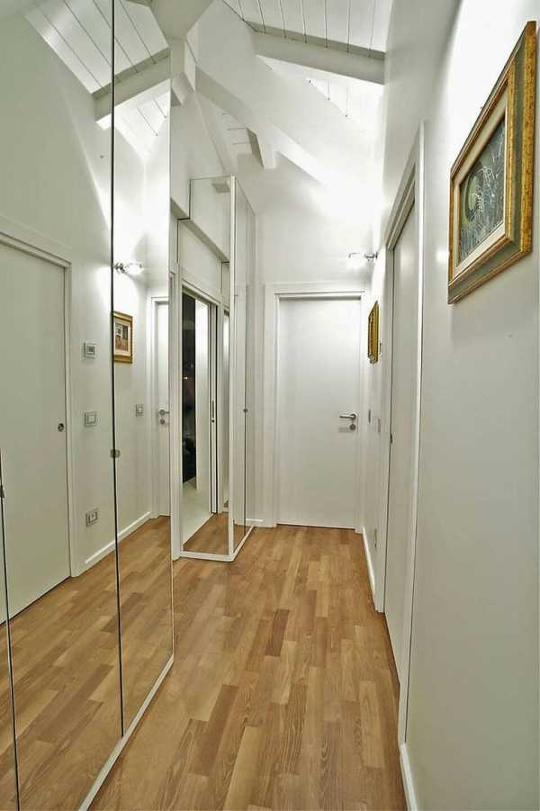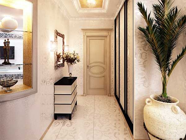 Глянцевые поверхности – ваш верный помощник в создании интерьера для узкого коридора. Светлый глянцевый потолок и пол, подобранные в едином цветовом решении, визуально значительно увеличат площадь коридора, и создадут ощущение пространства и света.