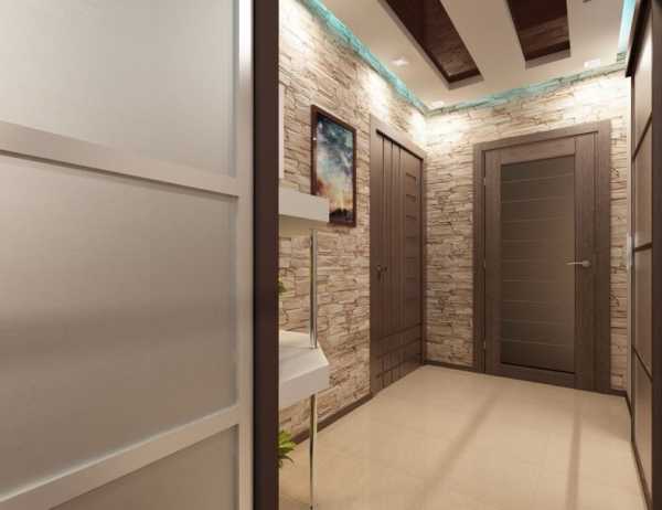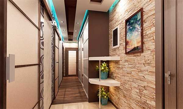 Для оформления длинного коридора отлично подойдут декоративная штукатурка и отделка искусственным камнем