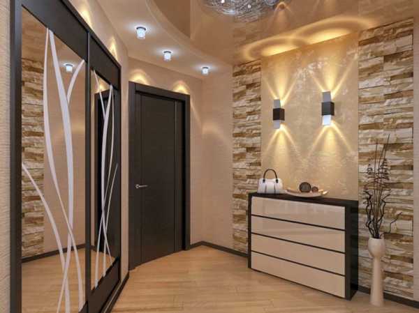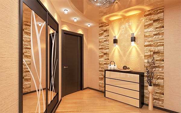 Характерной чертой прихожей многоквартирного дома является отсутствие окна, а значит и естественного освещения. Скорректировать этот недостаток помогут различные осветительные приборы. Это могут быть:
